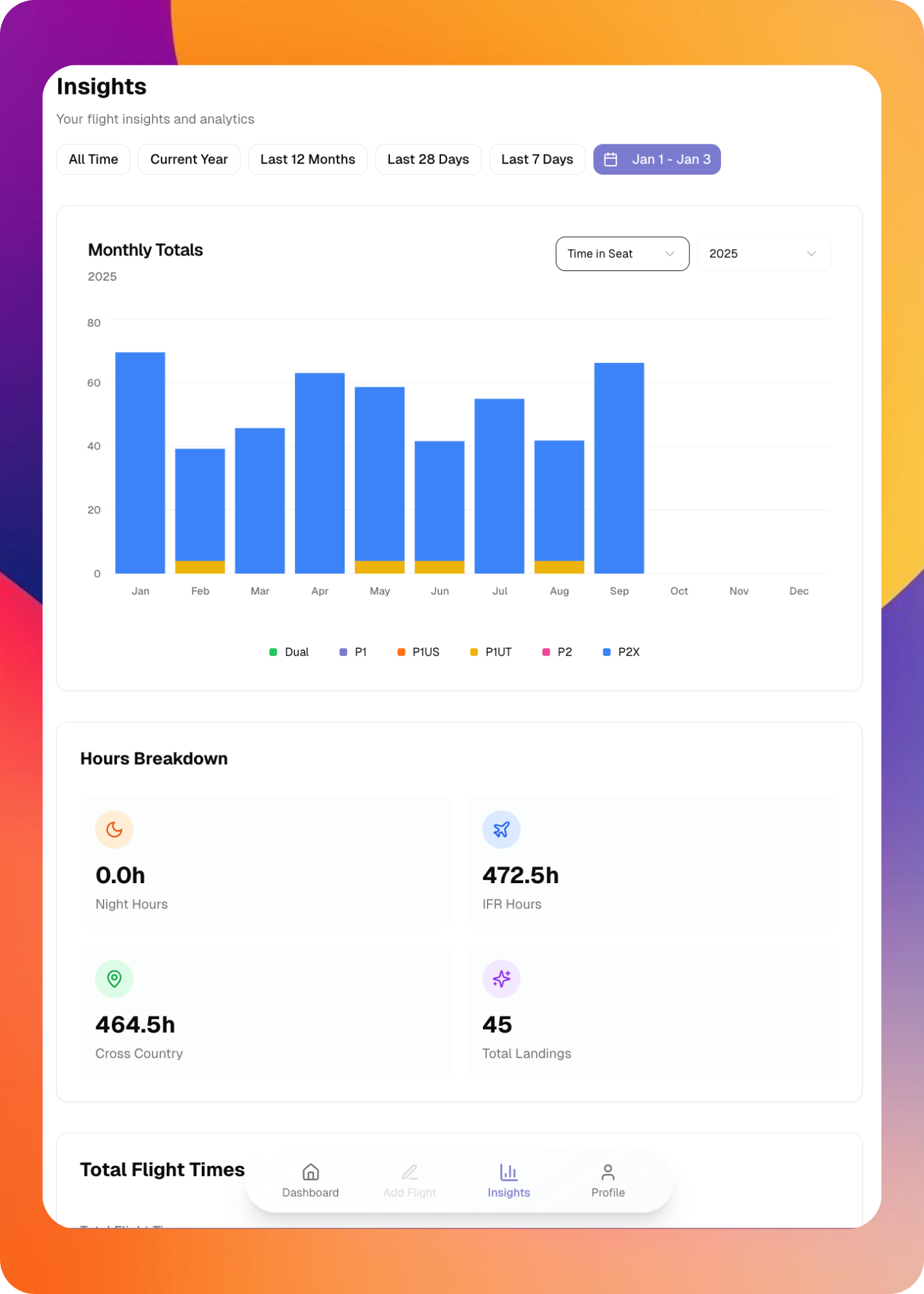 When you open the app, you’ll instantly see your total time, plus your hours for this month and this year. No hunting through views. No manual checks. Log flights, sims, or imports from the same screen.