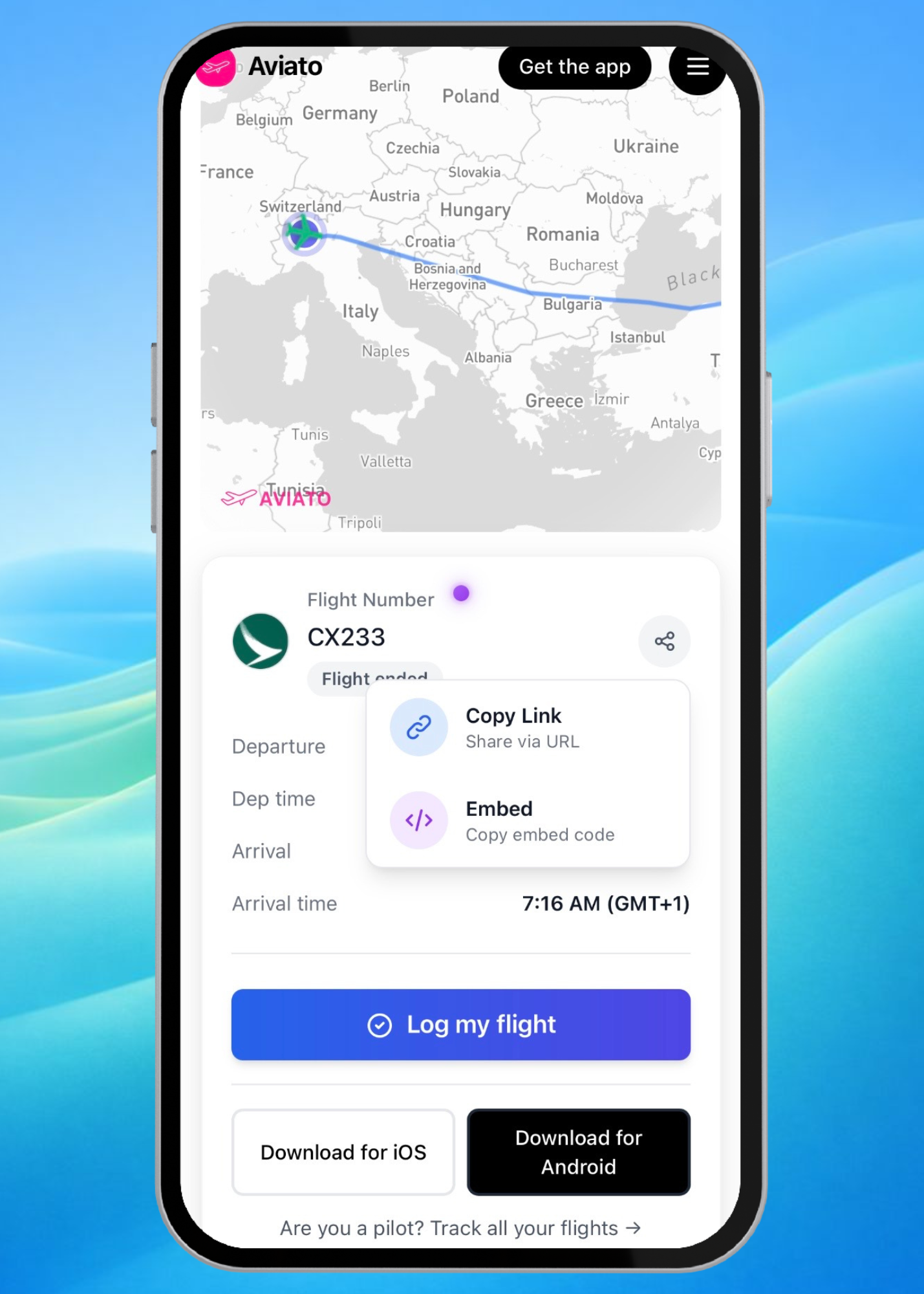 You can now share your upcoming flights with family or friends. Open a flight and generate a tracking link they can follow in real time. Whether it's a partner tracking your long-haul or family knowing when you land, they stay in the loop without you having to send updates mid-trip.