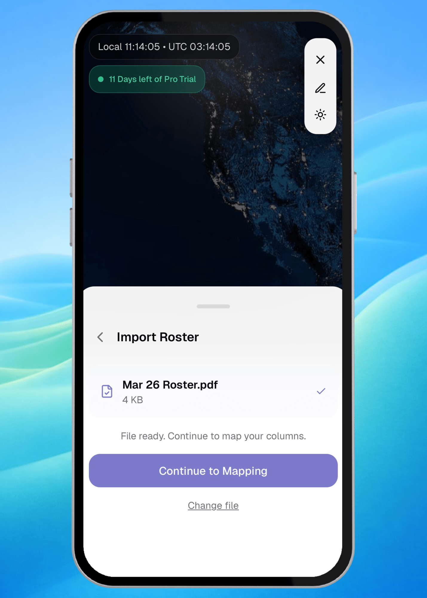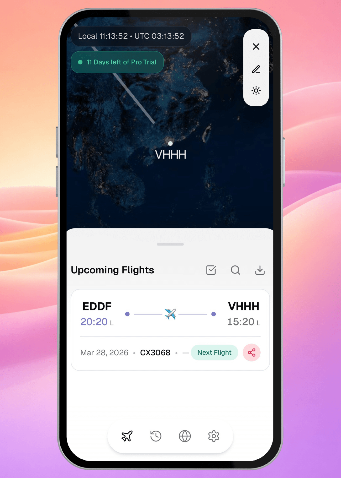 Add flights manually by searching a flight number and date, or import your roster directly as a PDF or CSV. From your dashboard select the import button next to the magnifying glass and follow through the importing flow.