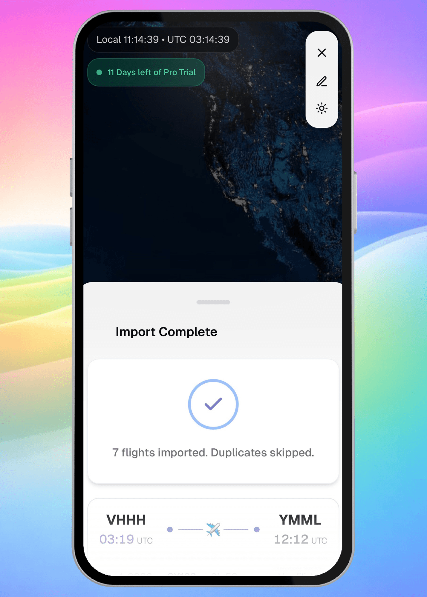 After your flight completes, Aviato detects it and logs it automatically within a 24-hour window. Routes, times, and day/night splits are all handled in the background, no manual entry needed.