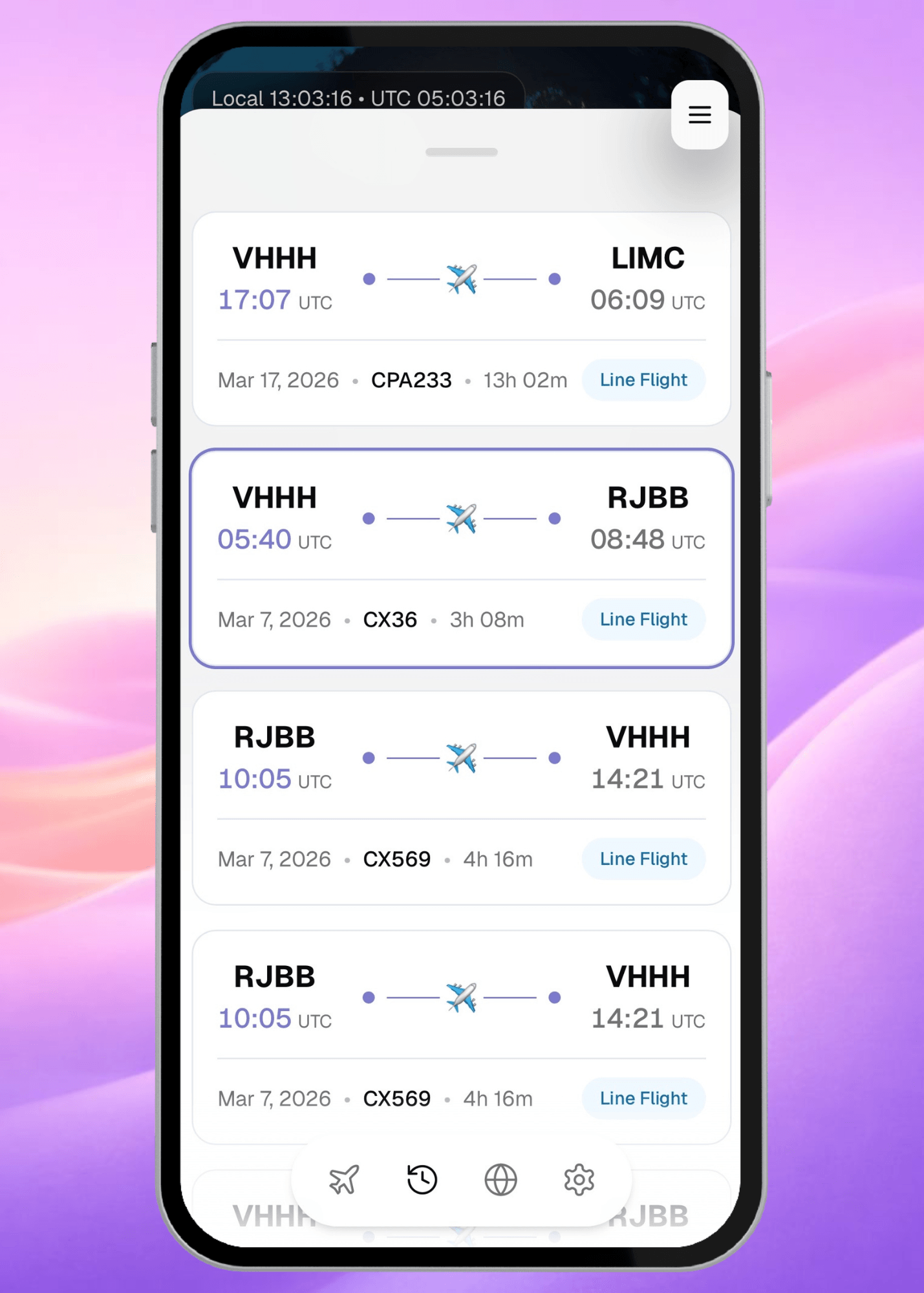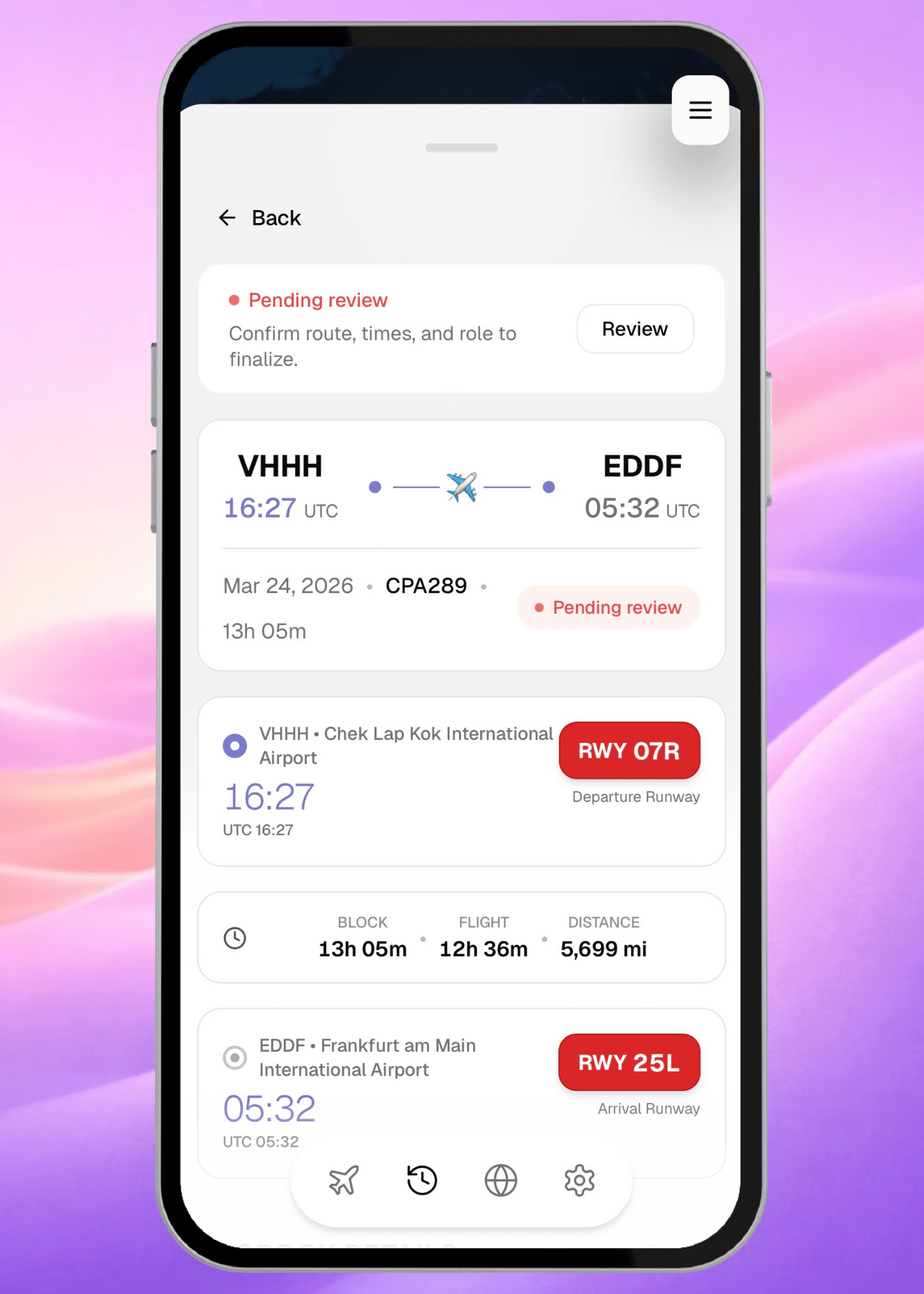 Open the flight entry to check everything looks right. The details will already be there, aircraft type, block times, sector information ready for you to confirm with a tap.